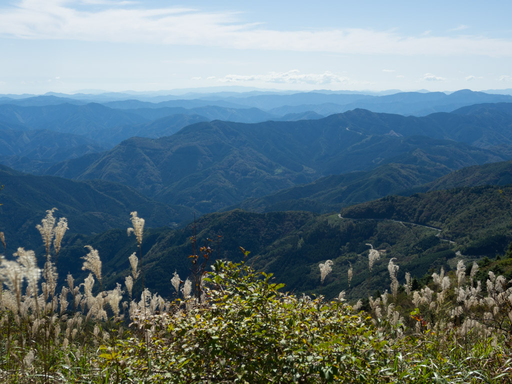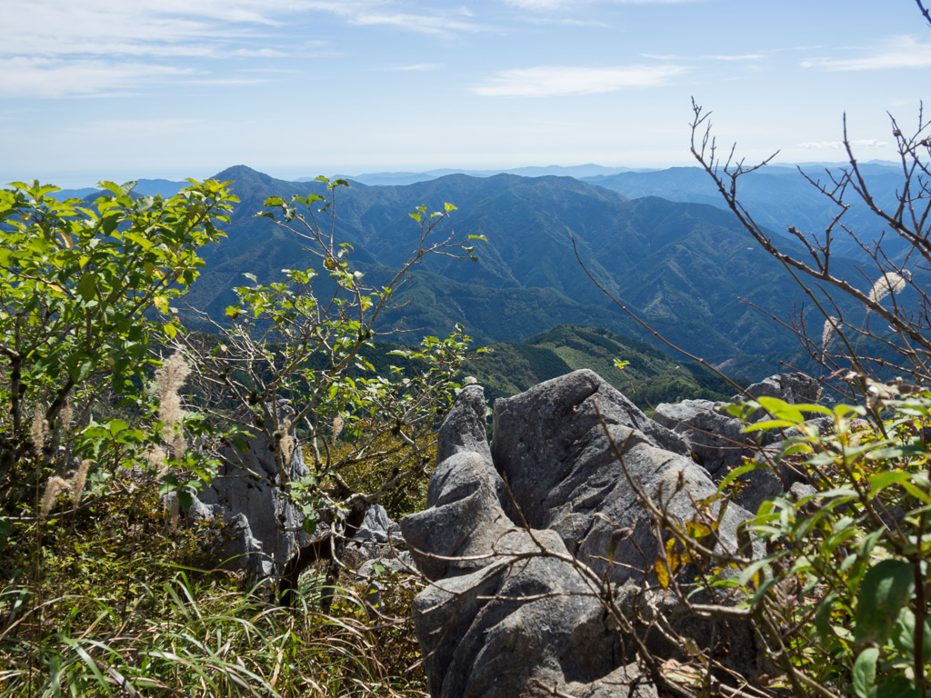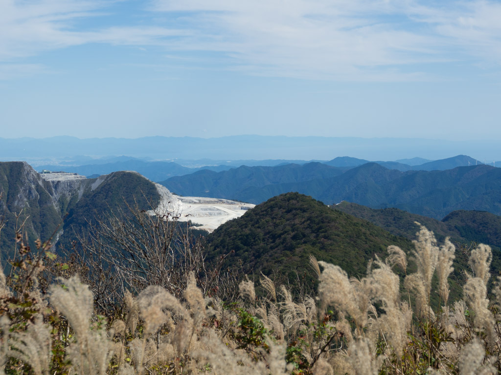 四国カルストって内陸のイメージがあったので海が見えるとは思ってなかったのですが、何か海っぽいですよね。双眼鏡で確認したら間違いなく海でした(笑)。意外と太平洋まで近かったんですね。手前に見える白っぽいところは鳥形山の採石場で、位置関係から推定して高知市から室戸岬まで長々と続く南東四国の海岸線が見えています。そんなところまで見えるとは驚きました。