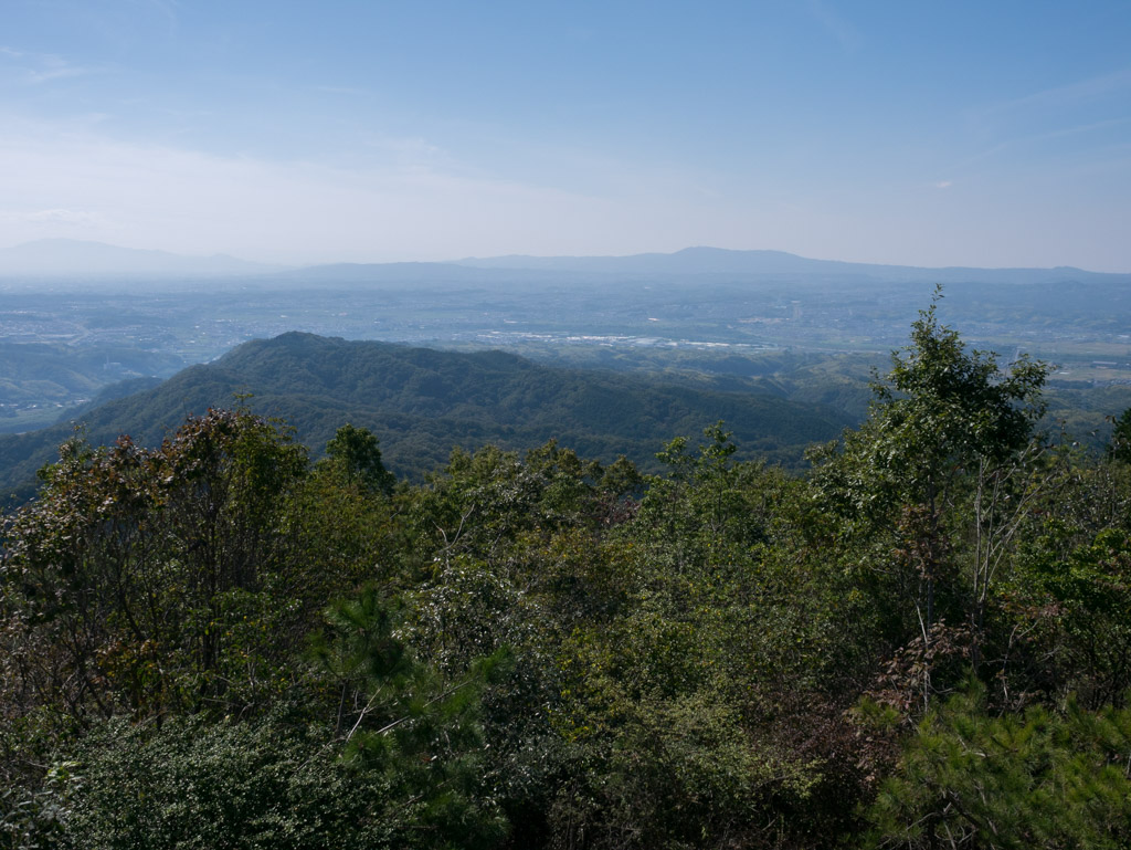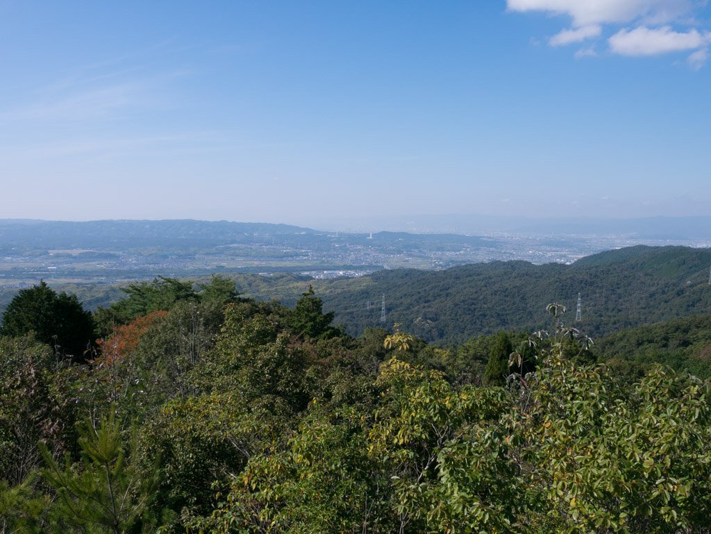 展望台に上がると360度の展望が得られます。標高は473mあり、万灯呂山より高いだけあって遠くまでよく見えますね。こちらは京田辺から八幡市方面です。