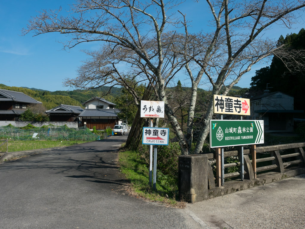 鳴子川沿いに出ると山城町森林公園を通過します。施設を利用するには有料ですが、通るだけなら無料です。さらに下って神童子の入口。ちょっと遠回りさせられましたが、川沿いにまっすぐ行っても行けたみたいですね。