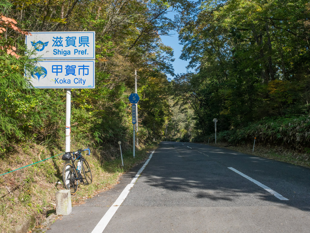 府県境の手前500mほどが勾配6%あり、唯一の上りらしい上りですね。標高約350mのピークを越えて滋賀県甲賀市に入ります。昔は信楽町でしたが。やっぱりここでみんな写真撮るよな(笑)。