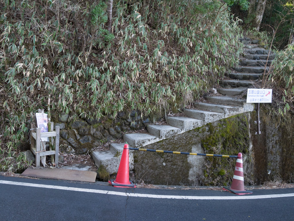 玉置山へは神社に参拝してから登る人が多いと思いますが、あえて逆回りで先に玉置山に登ります。駐車場の入口から少し車道を戻ったところにコンクリートの階段があり、そこが登山口になっています。