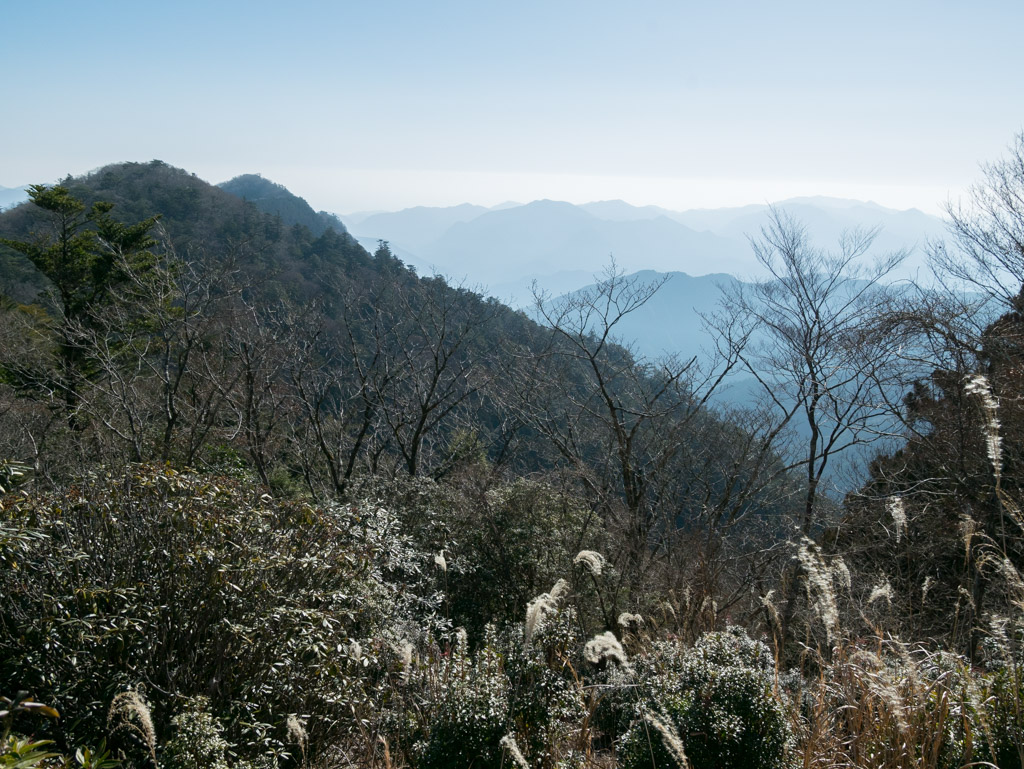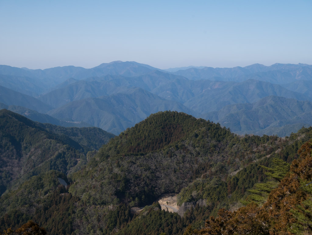山頂は木が茂ってあまり展望は良くありません。わずかに開けた南東側からは熊野灘が見えるはずですが、霞んでいてちょっと見えませんね。