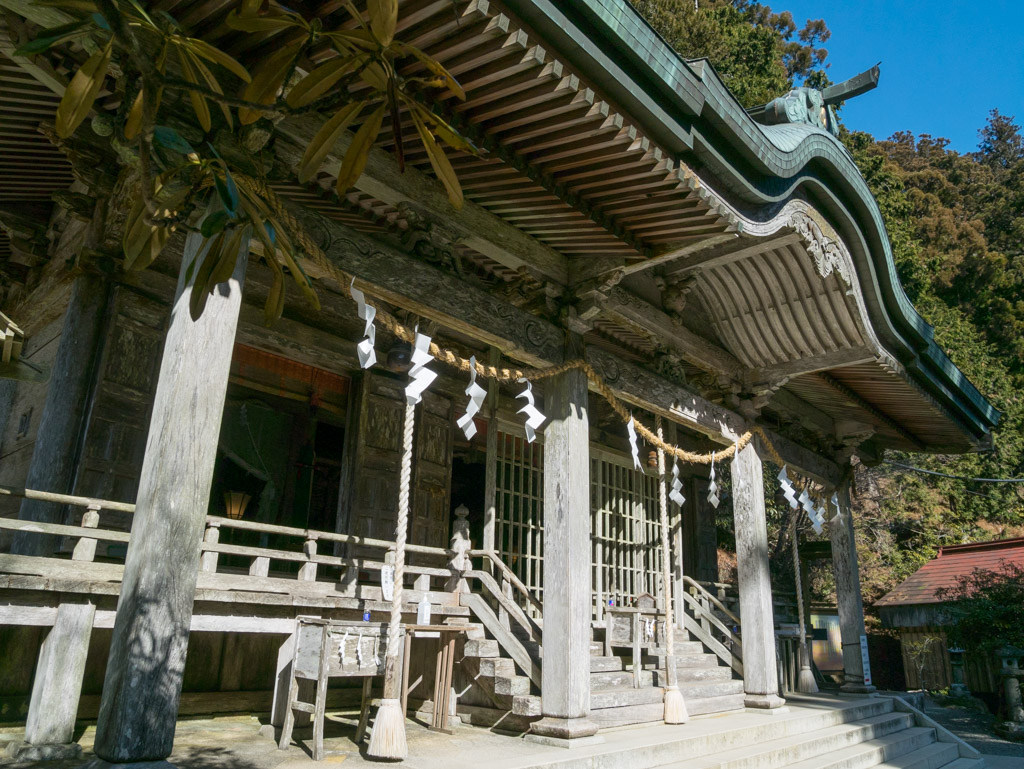 厳かな雰囲気が漂っています。本殿は急斜面の上に建っているので後ろに下がる余地がなく、全体を収めるのは難しい。