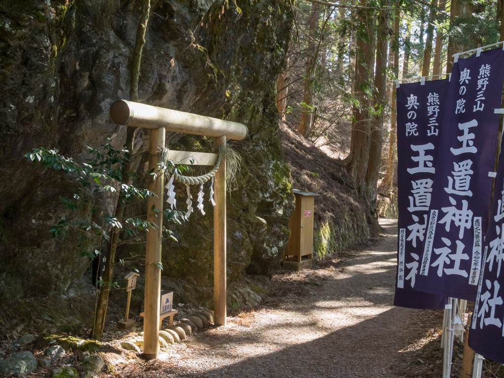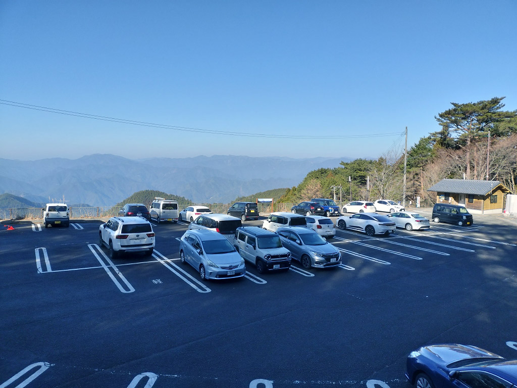 瀞峡方面から玉置口を経て登る道は距離が長く、延々と狭い道を走らなければなりません。はっきり言ってここまで来る方がしんどい(笑)。土曜日なので満車を心配しましたが、さすがにこの時期に来る人は少ないのか、半分ほどの駐車率でした。ご覧の通り、雪はかけらもありません。快晴で日が当たってるとポカポカ暑いくらい。