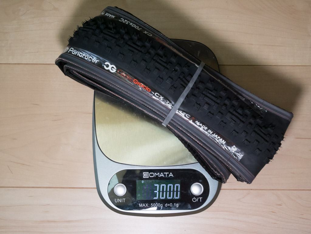 このタイヤの最大の特徴は、32Cのブロックパターンでありながら公称300gという軽さです。これならロードバイク用のタイヤにも匹敵しますね。今使っているFLYING DIAMONDが500gもあるので、前後で一気に400gも軽量化されることになります。