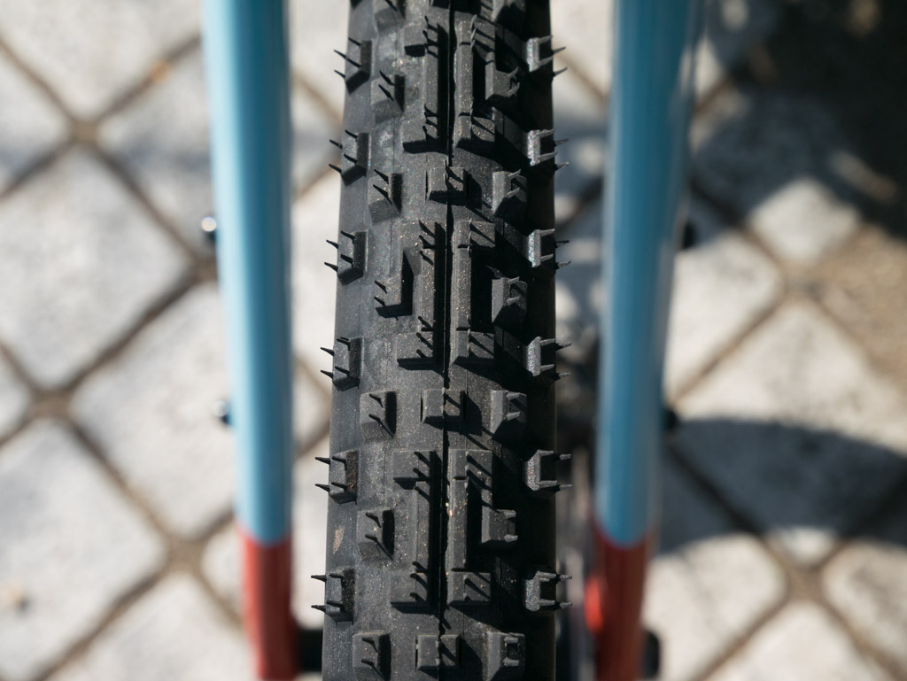 実はこのバイクにスキンサイド以外のタイヤを着けたのは初めてですが、意外とオールブラックも引き締まって見えてかっこいいですね。グラベルバイクにツルツルのスリックタイヤを履かせると締まりのない感じがしますが、ブロックパターンだとワイルド感が出てかっこいいです。