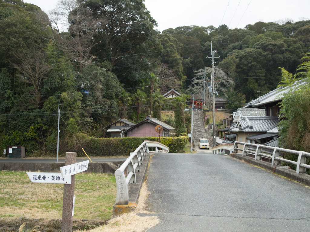 加茂駅東口からまっすぐ東へ進むと御霊神社に突き当たります。この橋の手前を左折。