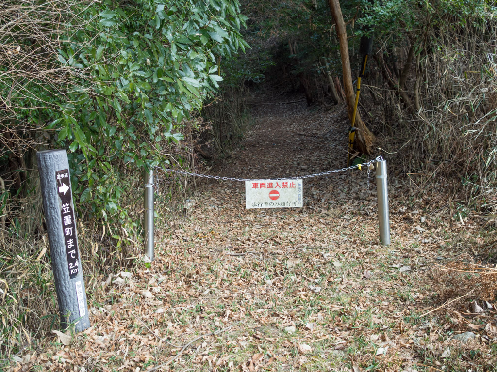 再び南側に広がる茶畑に抜けたところ、ここから完全な山道となります。車両は通行止めで歩行者のみが通れます。自転車も押せば通っていいと思いますが、ガレたところも多いので実質ほとんど押し歩きになります。