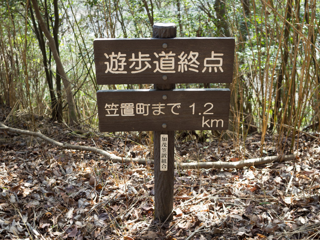 そして唐突に遊歩道終点の道標が現れました。この先は未舗装の林道となります。あと30分で1.2kmか、何とか間に合いそうですが、ここから激下りなので気を抜けません。