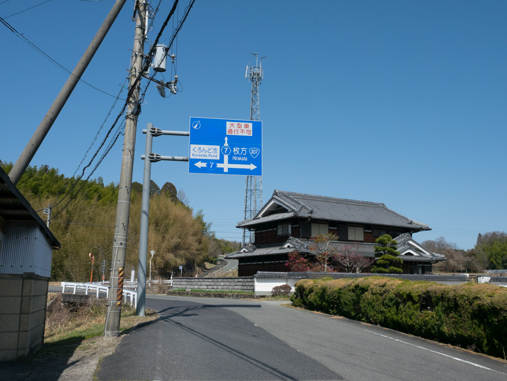 高船のT字路にある標識。TOJのコースはここを左折してKOMポイントを通過しますが、それとは逆に右折して高船の峠を越えます。
