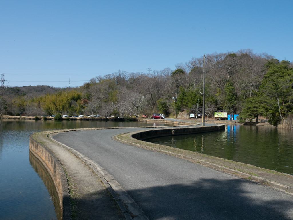 ピークからしばらく下って髙山溜池の畔に出ます。傍示の交差点を左折してくろんど池へ向かいます。