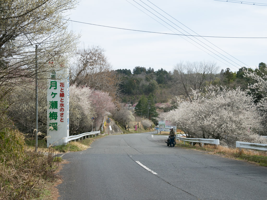 少し下って月ヶ瀬梅渓の看板のところ。このあたりも満開になっているので期待が膨らみます。
