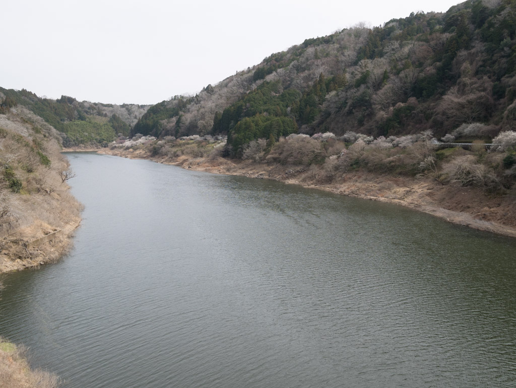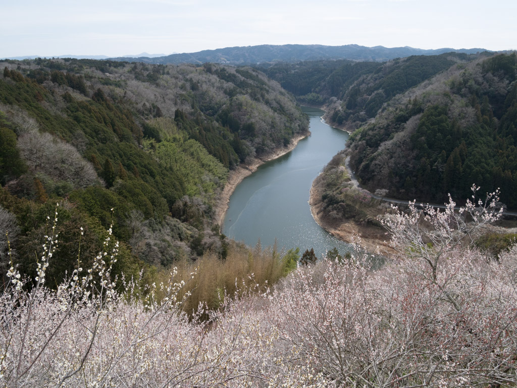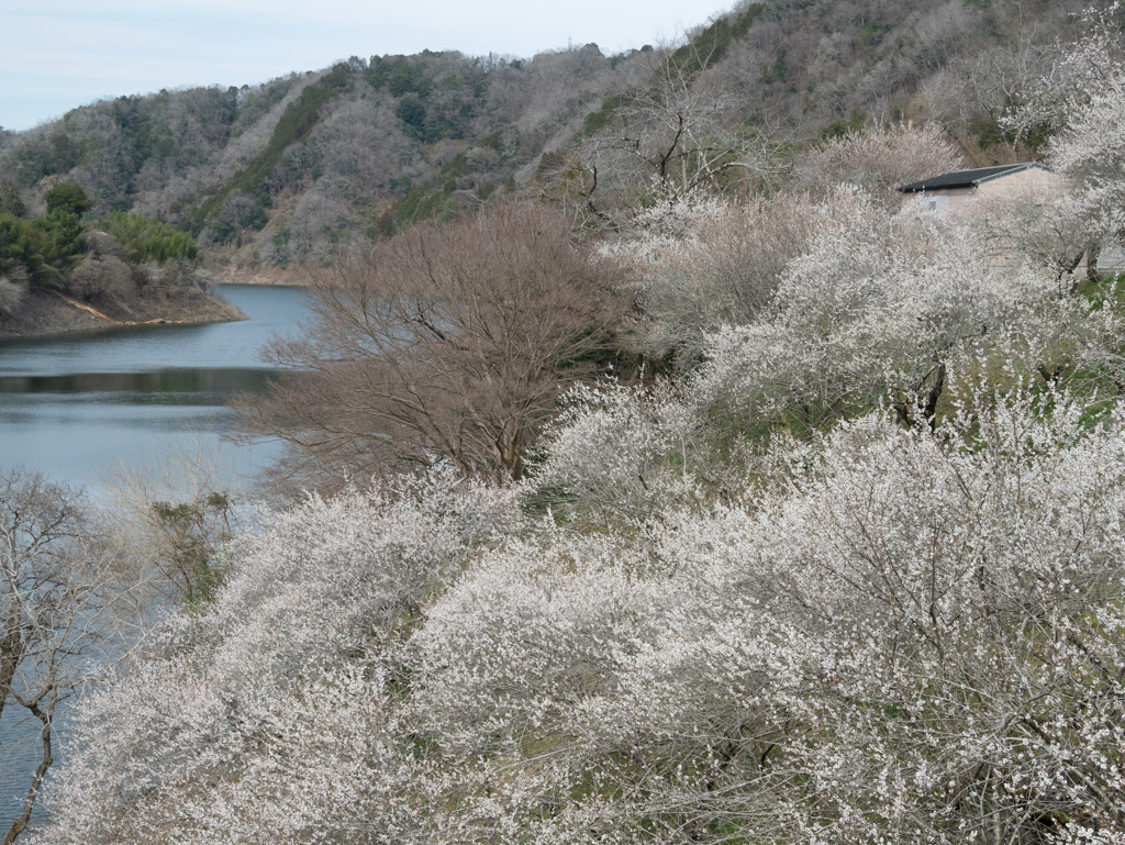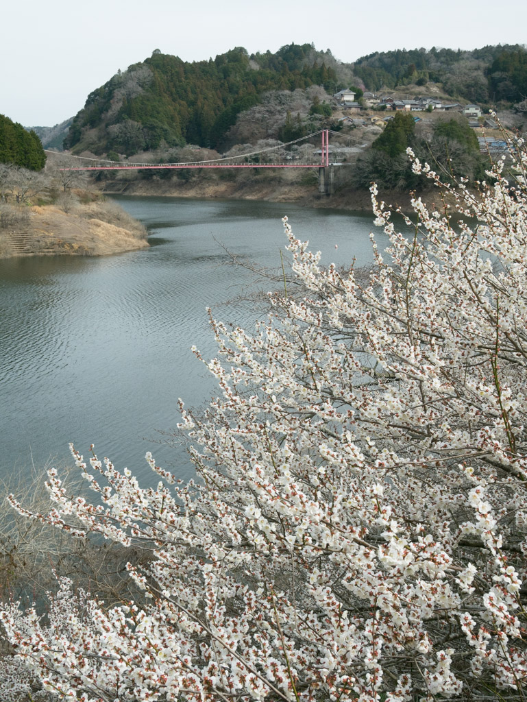 県道4号との分岐を過ぎて川の流れが北向きに変わったところ。ここはいつも撮るスポットですが、八幡橋と湖面を背景にした絶景が狙えます。梅もまさに今が満開な感じでした。