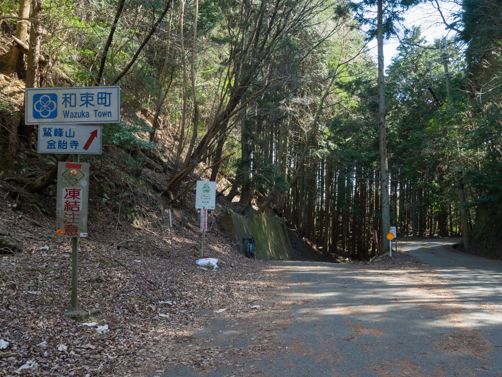 和束町側を見たところ。右へ分岐する道は鷲峰山林道で、金胎寺を経て犬打峠へ通じています。ただ現在は犬打峠の旧道が通行止めのため抜けられません。
