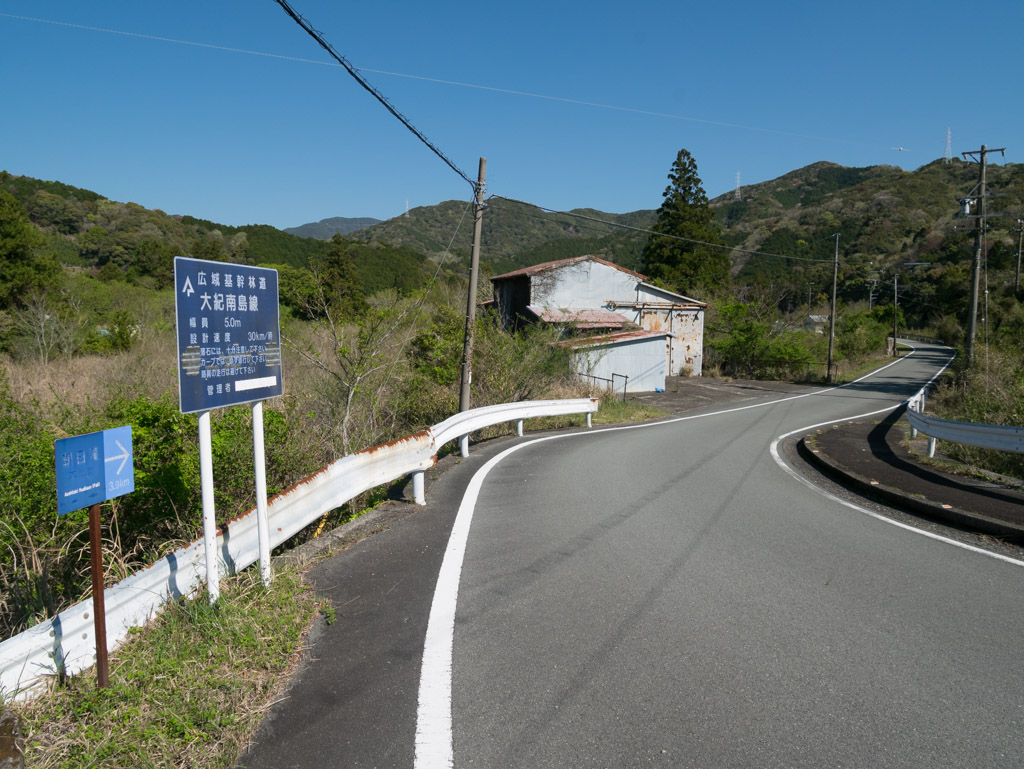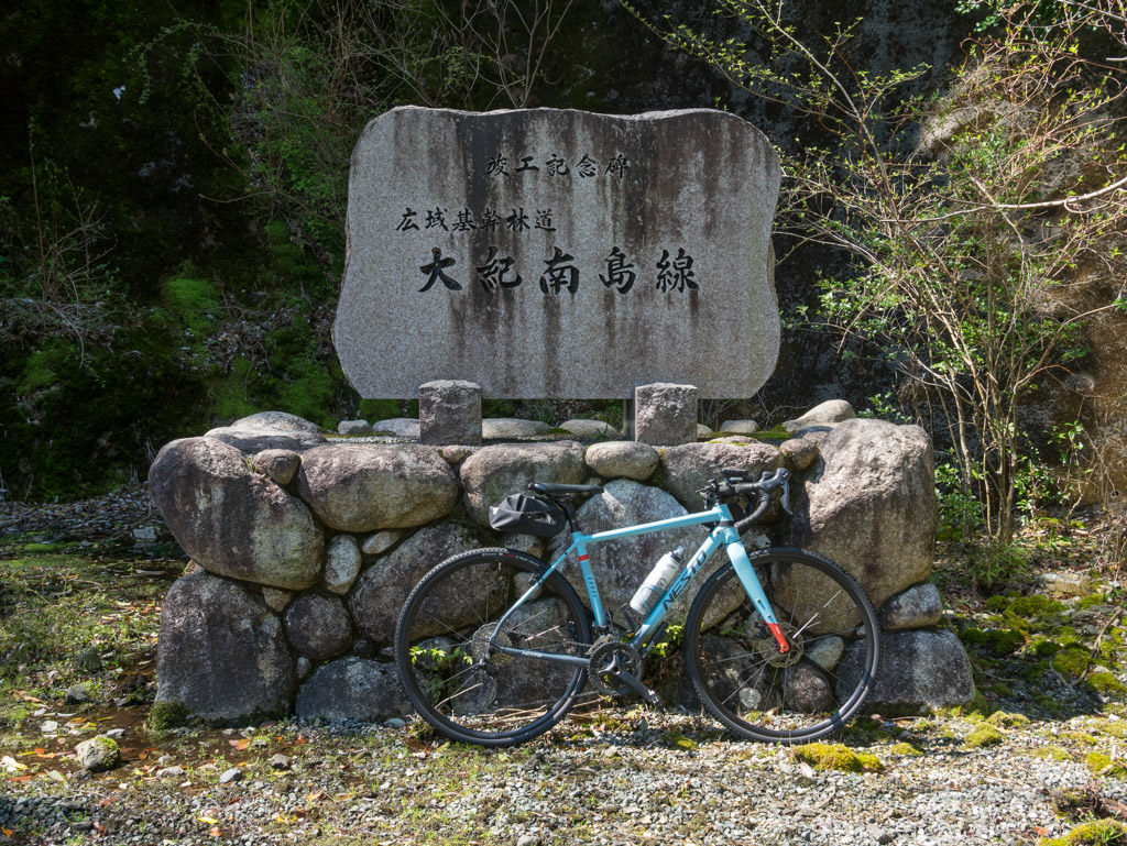 吉津の町中を抜けて、ここから大紀南島林道に入っていきます。しばらくの間、村山川に沿ってほぼ平坦な道が続きます。実はこの道、21年前に逆向きから一度走ったことがあります。今回は海抜0mから標高410mへの上りなので、かなり登りごたえがありそうです(汗)。