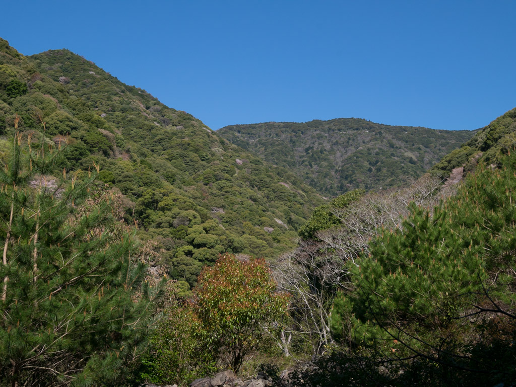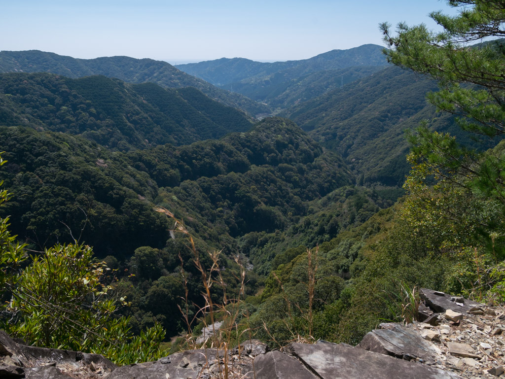 標高350mを超えて峠に近い場所ですが、一ヶ所だけ展望が開けます。あの谷の下から延々登ってきたわけですよ。たぶん21年前に撮った写真と同じ場所ですが、だいぶ木が茂って道が見えなくなってますね。