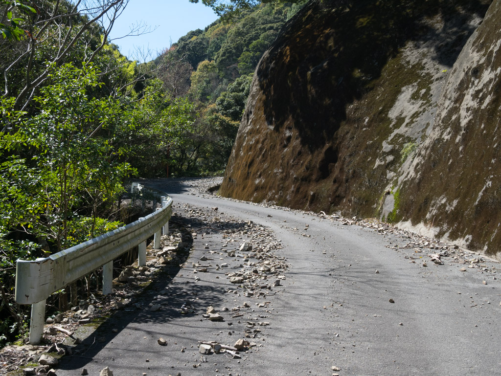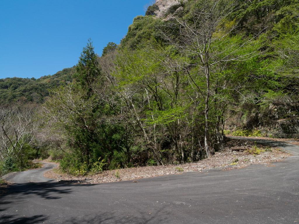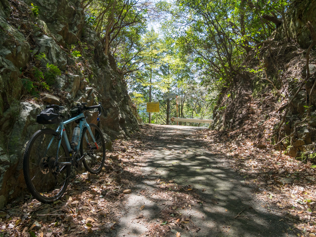 そして憧れ続けた古和峠に到達しました。標高は約390m、岩をくり抜いたような荒々しい切り通しになっています。この写真、NRさんのブログで見たぞ(笑)。これまで車は1台も会いませでしたが、何と峠に1台停まっていてビックリ。三脚に望遠鏡が設置されていて、バードウォッチングをしているようでした。こんな道、絶対車で通りたくないわ(笑)。