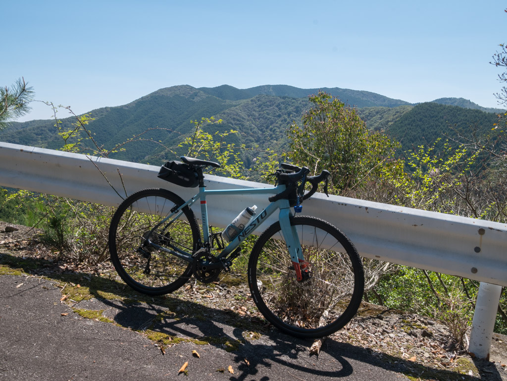 ちょっと見えにくいですが、山の稜線近くに道が見えますよね。あそこまで登るんですよ。こういうのを見ると「うへ~」ってなりますが、漕ぎ続ければいつかは着くんだから耐えましょう(笑)。