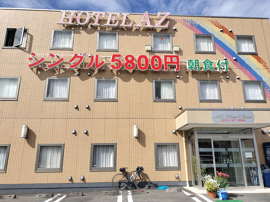 午後3時過ぎ、名張市のホテルAZに到着しました。もうチェックイン可能ですけど、やっぱり早かったな。AZグループは九州を中心に展開しているホテルチェーンで、最近全国に新規開店しています。日に関係なく朝食付き5850円とリーズナブル。去年四国で泊まった時より1000円値上がりしましたが、それでも相場に比べると安いですね。よくある食パン無料みたいなのと違ってちゃんとした朝食が食べられるのでおすすめ。自転車に優しいホテルをPRしているので、全店どこでも自転車持ち込み可なのも嬉しい。とても親切にしていただけました。